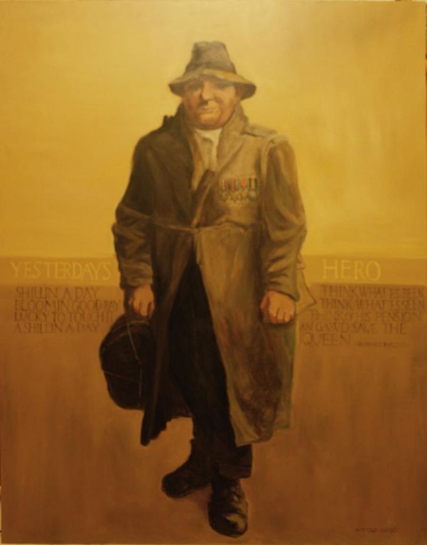 Modified copy - alkyd on boardThis is a copy of the painting by Harold Wood that sits in the entrance of Tramp Club in Piccadilly, London. In the original, the tramp's left arm is missing and the sleeve of his coat is pinned up. However, the clients wanted his arm to be reinstated. This painting now sits in the bar of the new extension to the club.