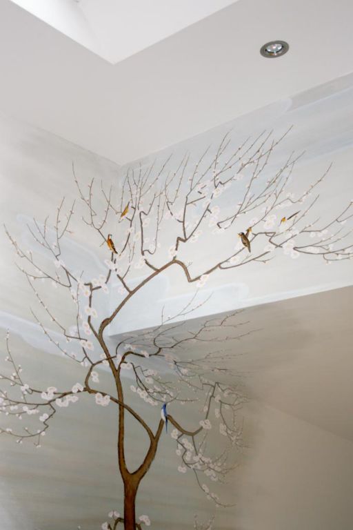 Wiped out treeThe bedroom walls were given a graded colourwash and then a leafless oriental tree was wiped out with a wet cloth. It was then fixed with acrylic varnish.