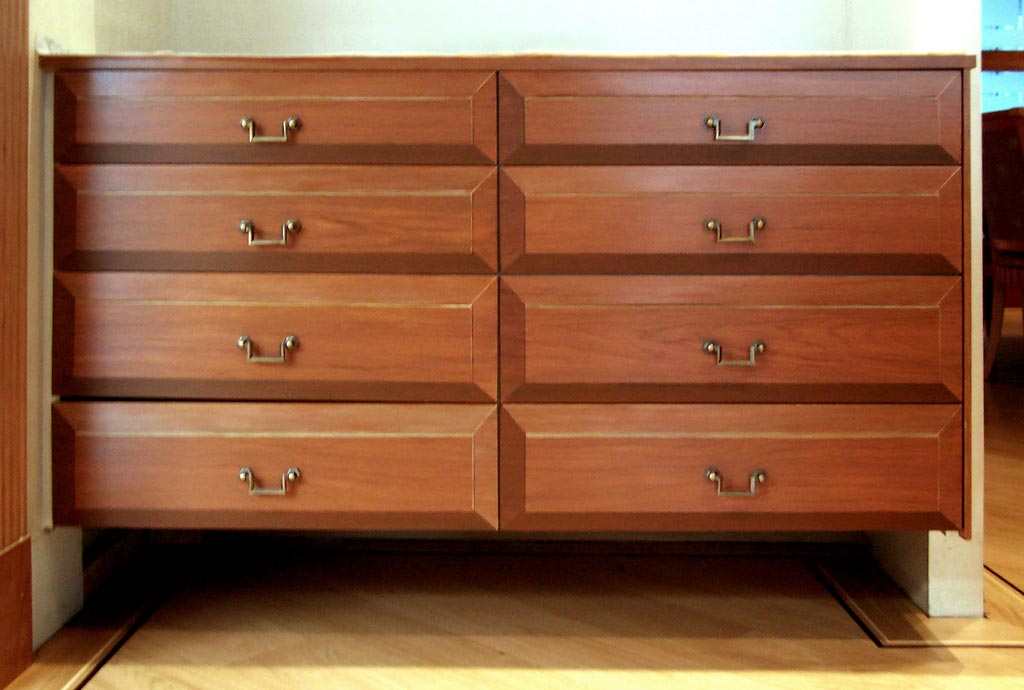 Trompe l'oeil bookcase of Hebrew books over alcove cupboardsAlcove cupboards and drawer unit prior to work. Note that the drawers are flat.