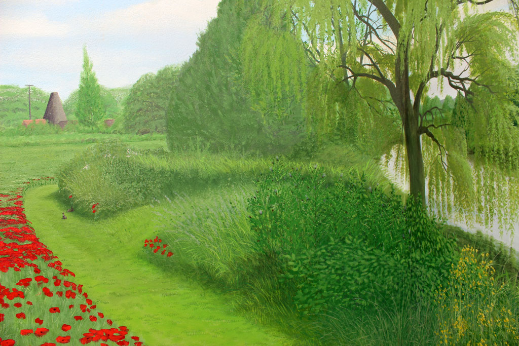 Terrace wallAdjoining a terrace, this mural is opposite a bedroom French window. It provides a lovely view when looking out. Although a ficticous scene, it incorporates details from the surrounding area of the village of Brill in Bucksinghamshire. Clients comment "The finished picture looks great - especially with the Kite. - It really makes SUCH a difference! Thank you."