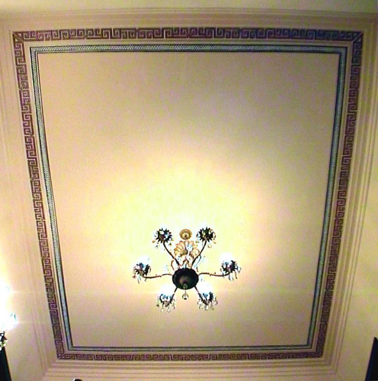 Floral ceiling decorationThe black on gold decoration in the background was done by another artist. My brief was to paint a gold on beige version on the inset ceiling in the same style.