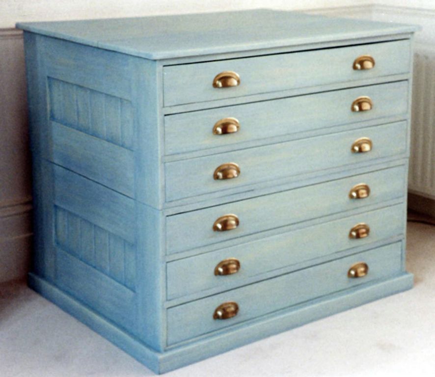Distressed paintworkThis plan chest was undercoated in a pale yellow before having a duck-egg blue rubbed over and distressed and then a transparent blue was put on and distressed.